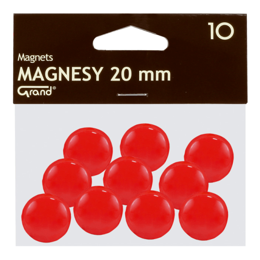 Punkty magnetyczne GRAND o średnicy 20 mm to praktyczne i estetyczne akcesoria, które idealnie sprawdzają się do przypinania kartek, planów, ogłoszeń czy zdjęć na tablicach oraz metalowych powierzchniach. Solidna plastikowa obudowa ułatwia chwytanie, a intensywny czerwony kolor świetnie wyróżnia zaznaczone elementy.