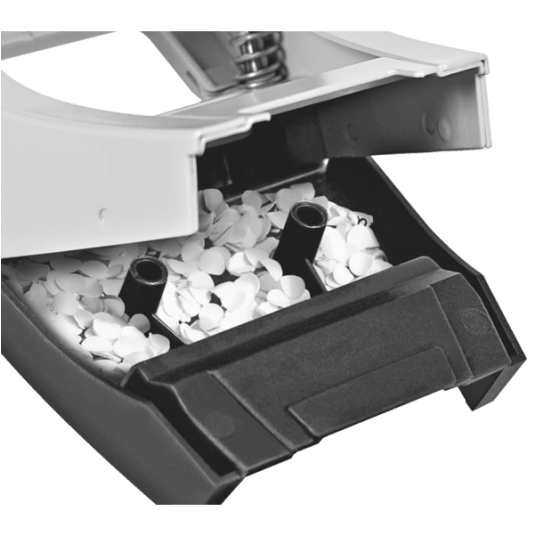 - Łatwy do opróżniania pojemnik na ścinki zamontowany na zawiasach