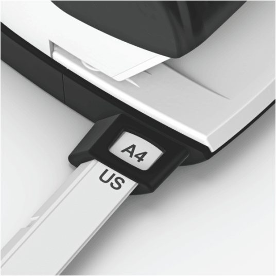 - Wyraźne oznaczenia formatu i wytrzymała prowadnica zapewniają perfekcyjne wyrównanie papieru