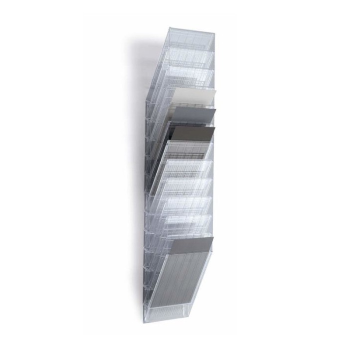 Dwunastoczęściowy naścienny zasobnik na prospekty bądź dokumenty o formacie A4 w pionie.