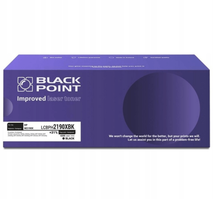 Toner Black Point do HP 219X (W2190X) w kolorze czarnym to wysokowydajny zamiennik stworzony z myślą o intensywnej eksploatacji w nowoczesnych biurach i firmach. Zapewnia wyraźny, głęboki czarny wydruk oraz stabilną, bezproblemową pracę od pierwszej do ostatniej strony. Dzięki zwiększonej pojemności pozwala wydrukować aż 4 200 stron, czyli nawet o 1 000 stron więcej niż oryginalny toner OEM, co przekłada się na realne oszczędności i rzadszą wymianę wkładów.