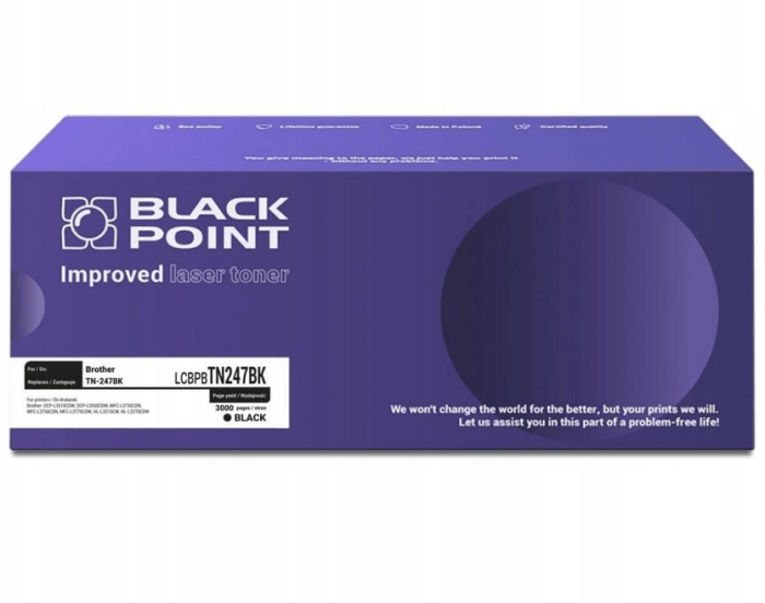 Wysokiej jakości czarny toner Black Point LCBPBTN247BK – zamiennik TN-247BK – zapewnia niezawodne działanie i idealną czerń w każdym wydruku. To gotowy do użycia wkład, który wystarczy włożyć do drukarki, aby od razu rozpocząć pracę. Bezproblemowy montaż, pełna kompatybilność i solidna, bezpieczna konstrukcja zapakowana w ochronny worek typu airbag.