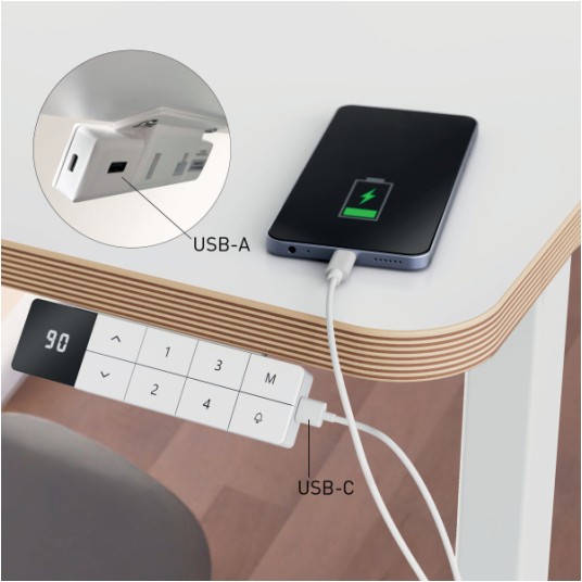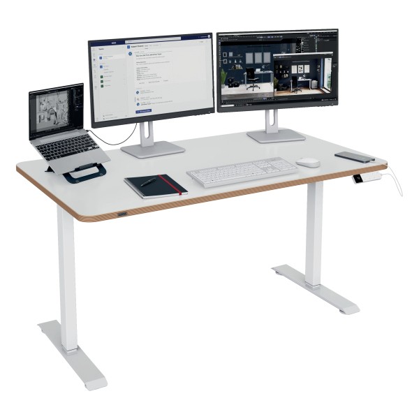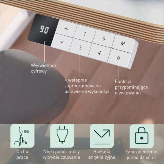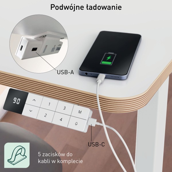 Cechy główne ✅ elektryczna regulacja wysokości umożliwia wygodną pracę na siedząco i stojąco ✅ duży blat 140 x 80 cm zapewnia przestrzeń na dwa monitory i akcesoria ✅ możliwość zapisania 4 ustawień wysokości ułatwia codzienne użytkowanie ✅ funkcja przypominania o wstawaniu wspiera aktywność w ciągu dnia ✅ cichy silnik zwiększa komfort pracy w biurze i home office ✅ porty USB-C i USB-A umożliwiają wygodne ładowanie urządzeń ✅ blokada antykolizyjna i blokada dziecięca zwiększają bezpieczeństwo ✅ w zestawie 5 uchwytów do kabli pomagających utrzymać porządek na biurku