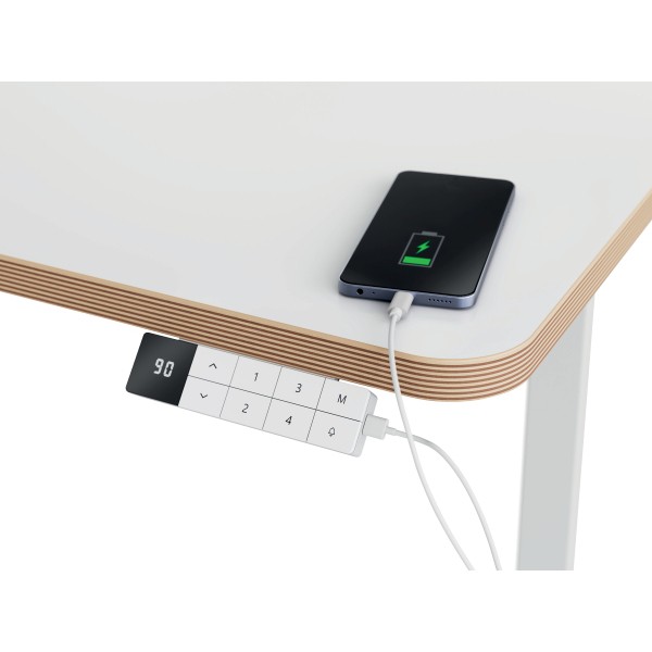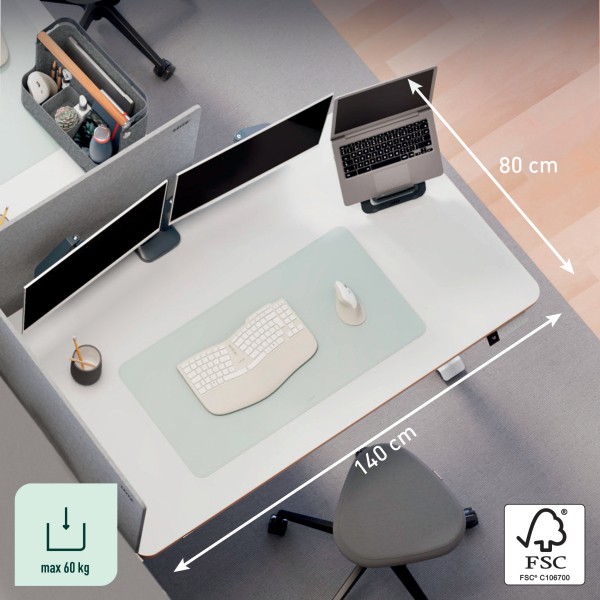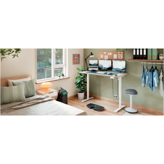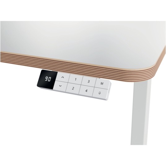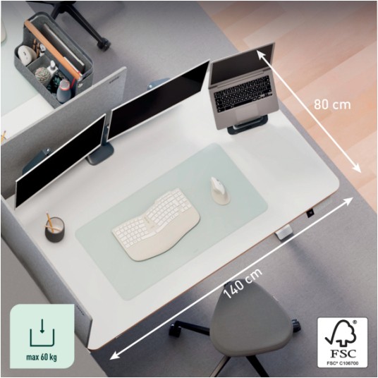 Specyfikacja • marka: LEITZ • linia: ERGO • rodzaj: biurko elektryczne z regulacją wysokości • kolor: biały • wymiary biurka: 1400 x 720 x 800 mm • wymiary blatu: 140 x 80 x 2,5 cm • zakres regulacji wysokości: 72–118 cm • rodzaj regulacji: elektryczna • liczba zapamiętywanych ustawień wysokości: 4 • maksymalne obciążenie: 60 kg • poziom hałasu silnika: poniżej 50 dB • panel sterowania: cyfrowy wyświetlacz wysokości, funkcja przypominania o wstawaniu, blokada dziecięca • porty ładowania: USB-C, USB-A • zabezpieczenia: blokada antykolizyjna, ochrona przed przegrzaniem • materiał: drewno konstrukcyjne z certyfikatem FSC • zużycie energii w trybie czuwania: <0,5 W • waga: 39,95 kg • dodatkowe elementy w zestawie: wtyczka UE, 5 samoprzylepnych przezroczystych klipsów do kabli, 2 klucze imbusowe