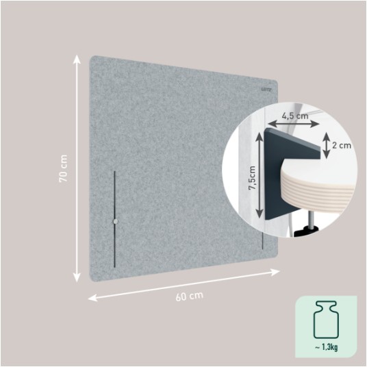 Specyfikacja • marka: LEITZ • rodzaj: ścianka działowa do biurka • kod produktu: 61220085 • kolor: szary • materiał: poliester • konstrukcja materiału: włóknina spajana termicznie • zawartość materiału z recyklingu: 75% plastiku z recyklingu poużytkowego (PET) • wymiary: 12 x 700 x 600 mm • grubość: 12 mm • waga: 1,96 kg • regulacja wysokości nad blatem: od 35 do 65 cm • sposób montażu: 2 zaciski w zestawie • maksymalna grubość blatu: do 30 mm • możliwość łączenia modułów: tak • funkcja organizacyjna: możliwość przypinania notatek i zdjęć