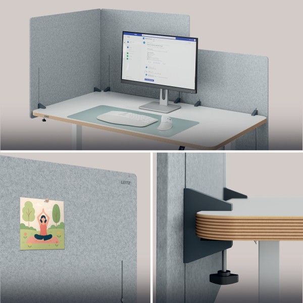 Ściana działowa do biurka LEITZ 70/80 cm szara to praktyczne rozwiązanie do organizacji bardziej komfortowej i uporządkowanej przestrzeni pracy. Pomaga zwiększyć prywatność, ograniczyć rozpraszanie wzroku i częściowo wytłumić hałas, dlatego świetnie sprawdza się w biurach open space, przy stanowiskach współdzielonych oraz w pracy hybrydowej. Regulowana wysokość pozwala łatwo dopasować ustawienie ścianki do aktualnych potrzeb, zarówno podczas rozmów telefonicznych, jak i pracy wymagającej skupienia. Dzięki minimalistycznemu wzornictwu produkt dobrze komponuje się z nowoczesnym wyposażeniem biura i home office. Ściankę można również wykorzystać jako praktyczną powierzchnię do przypinania notatek, zdjęć i ważnych informacji. To funkcjonalny wybór dla osób, które chcą poprawić koncentrację i lepiej zarządzać własną przestrzenią roboczą.