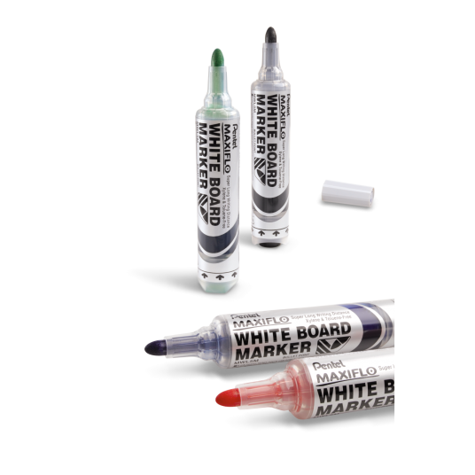Marker MAXIFLO do białych i ceramicznych tablic. Płynny tusz dozowany w razie konieczności nawilżenia końcówki za pomocą tłoczka (zamiast tradycyjnego sączka). Marker pisze wyrazistą linią aż do ostatniej kropli tuszu. Kilkakrotnie dłuższa linii pisania niż w standardowych markerach z sączkiem - 1100 m. Nie zawiera substancji trujących ksylenu, toluenu ani polichlorku winylu. Nadaje się również na papier, plastik, karton. Wykonany w 50% z materiałów przetworzonych.