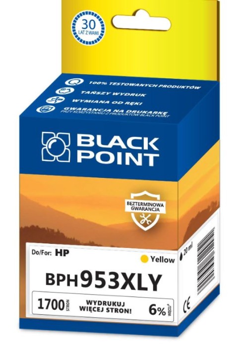 Black Point BPH953XLY. Zastepuje HP F6U18AE. Kolor: yellow . Wydajnosc: 1700 str. (wiecej o 100 str. - ISO 24711). Pojemnosc: 20 ml. Kompatybilny z: HP OfficeJet Pro: 7720, 7730, 7740, 8210, 8218 8710, 8715, 8720, 8725, 8730, 8740