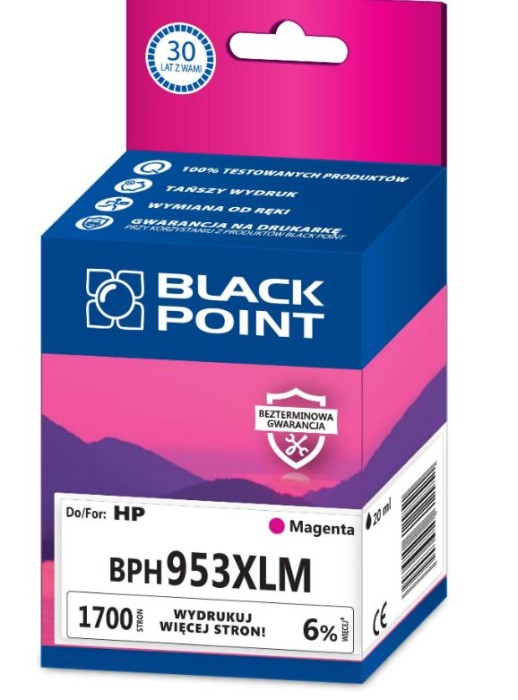 Black Point BPH953XLM. Zastepuje HP F6U17AE. Kolor: magenta. Wydajnosc: 1700 str. (wiecej o 100 str. - ISO 24711). Pojemnosc: 20 ml. Kompatybilny z: HP OfficeJet Pro: 7720, 7730, 7740, 8210, 8218 8710, 8715, 8720, 8725, 8730, 8740