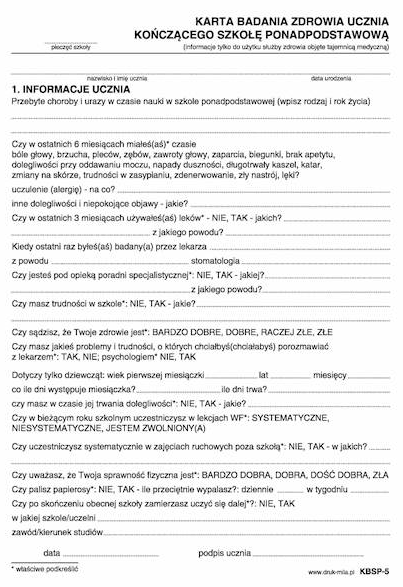 ✅ Karta badania zdrowia ucznia kończącego szkołę ponadpodstawową