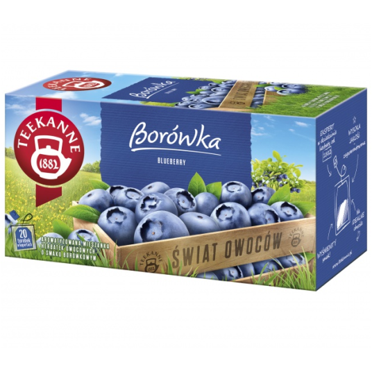 Herbata owocowa TEEKANNE Borówka to prawdziwa przyjemność dla podniebienia – pełen aromat i smak świeżych, dojrzałych borówek zamknięty w wygodnych torebkach. To doskonały wybór dla wszystkich, którzy lubią naturalną owocową słodycz w filiżance.