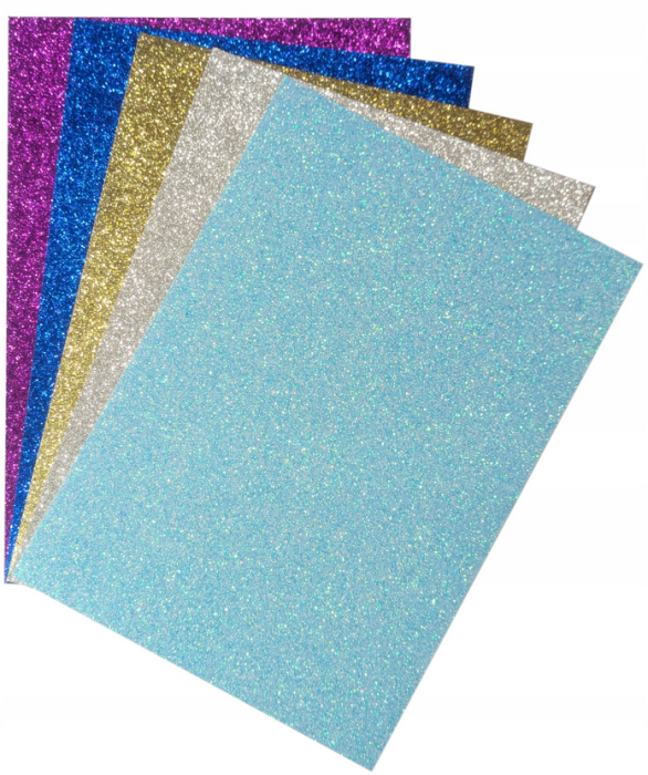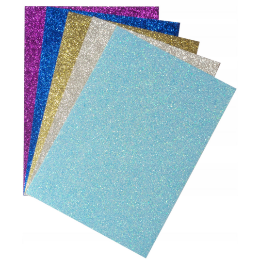 Zestaw 5 arkuszy w formacie A4 w intensywnych kolorach o fakturze chropowatej z brokatowym wykończeniem. Przeznaczone do zdobienia zaproszeń, kartek okolicznościowych, pudełek.