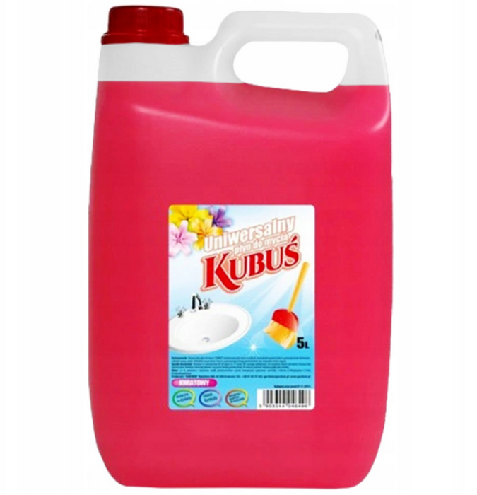 Płyn uniwersalny KUBUŚ 5L (zapach kwiatowy) to wszechstronny środek do codziennego sprzątania domu i miejsca pracy. Skutecznie rozpuszcza tłuszcz, kurz i typowe zabrudzenia z blatów, podłóg, płytek oraz wyposażenia kuchni i łazienki. Może być stosowany do mycia naczyń – po użyciu należy dokładnie spłukać powierzchnię wodą. Skoncentrowana formuła pozwala dobrać stężenie do rodzaju zabrudzeń, a po umyciu nie pozostawia smug ani zacieków. Delikatny, kwiatowy zapach pozostawia w pomieszczeniach wrażenie świeżości. Duża pojemność 5 litrów zapewnia wysoką wydajność i ekonomię stosowania w domu, firmie czy gastronomii. Płyn nadaje się do wielu typów powierzchni, w tym ceramiki, szkła, laminatów, stali nierdzewnej i plastiku.