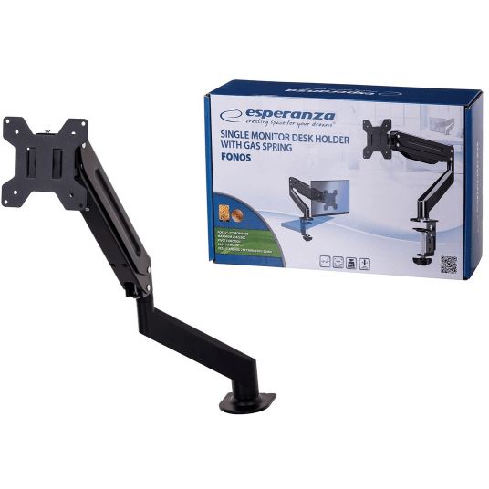 ESPERANZA FONOS to biurkowe ramię do jednego monitora z amortyzacją sprężyną gazową, które łączy dużą płynność regulacji z oszczędnością miejsca na blacie. Uchwyt pozwala swobodnie ustawić ekran 17–27" w płaszczyźnie pionowej i poziomej, a także pracować w trybie pivot. Precyzyjna sprężyna gazowa utrzymuje zadane położenie bez opadania i umożliwia lekką zmianę wysokości jedną ręką. Montaż odbywa się przy pomocy mocnego imadła z miękką podkładką chroniącą blat. Zgodność z VESA 75×75 i 100×100 zapewnia szeroką kompatybilność z monitorami biurowymi. Duży wysięg ramienia ułatwia dosunięcie ekranu do użytkownika lub odstawienie go w głąb biurka. Konstrukcja metalowa gwarantuje stabilność do 6 kg i niezawodną pracę na co dzień.