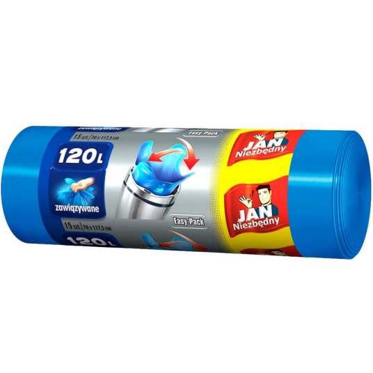 Mocne worki Jan Niezbędny Easy-Pack HD o pojemności 120 litrów to niezawodne rozwiązanie do dużych koszy i intensywnego użytkowania. Dzięki specjalnym „uszom” można je łatwo zawiązać, co zapewnia szczelność i wygodne przenoszenie odpadów.
