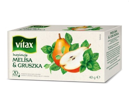Herbata owocowo-ziołowa w torebkach ekspresowych o smaku melisy i gruszki. Przeznaczona do zaparzania na gorąco lub na zimno. Produkt bez kofeiny.